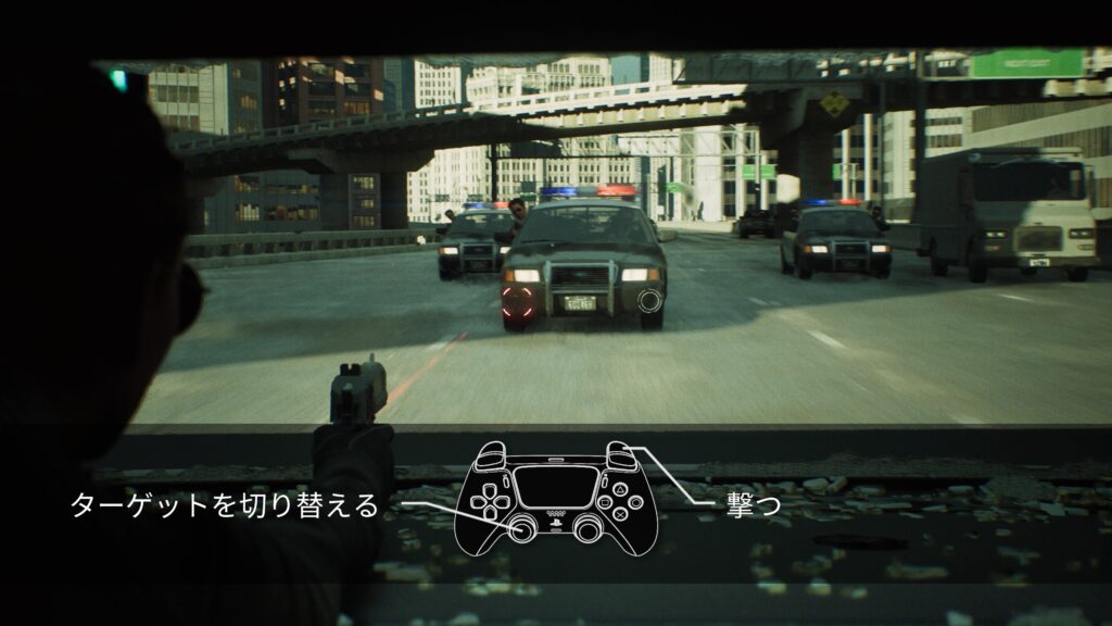 映画っぽいのにオンスクリーン表示が出たりするので、ゲームなんだと気付かされます。もちろん、コントローラの振動は劇中のアクションにシンクロします。