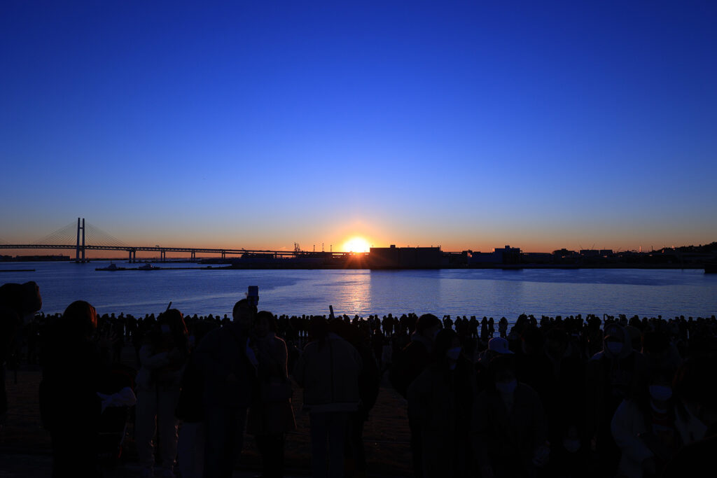 横浜大桟橋から初日の出を見てきました。通常だと八景島とか大山から観ることが多いのですが、八景島は今年は(今年も?)夜間営業せず入島できず、大山はケーブルカーが5:00からの運行ということでヘタすると搭乗待ち行列がさばききれず日の出に間に合わない可能性があり、それならばと行ったことはありませんでしたが大桟橋に行ってみたものです。駐車場は大桟橋に停められましたが、4:30くらいには満車になっていましたかね。ただ、出庫がすごい混むので、大桟橋ではなく近隣の小さな駐車場に停めても帰れる時間はそんなに変わらないと思います。