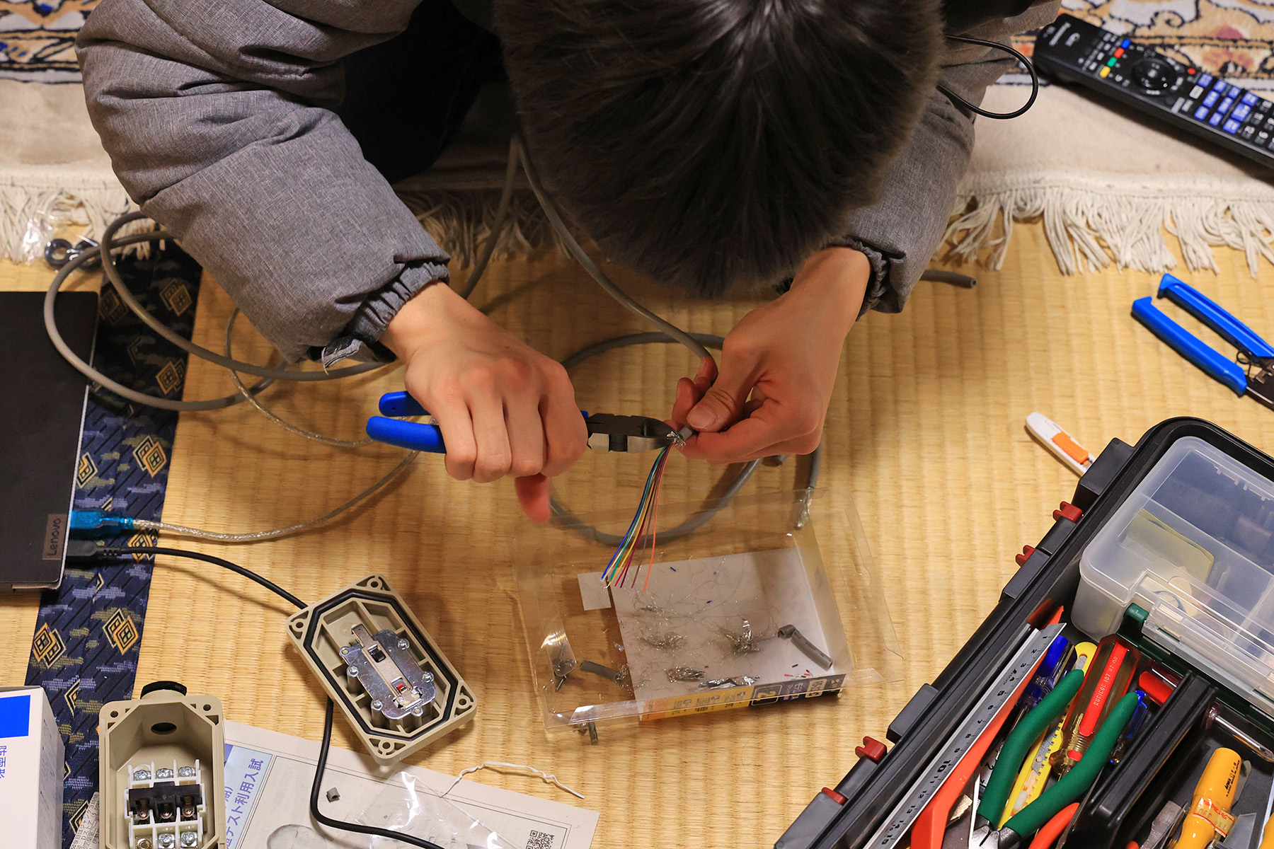USB – RS232Cケーブル自体には手を付けず、そこから安価なD-sub 9pinの延長ケーブルをバラして接続させました。9芯ケーブルの皮むきは初めてだったので指導しました。あとはなんとか勝手にやって動かせたようです。ネット動画で有志の方による手順が懇切丁寧に説明されているので、それを観ながらできるようですね。ダウンジャケットを脱ぐ前に皮むきに着手している夢中っぷりは大事だと思います。これくらい夢中になれることがあると良いですよね。