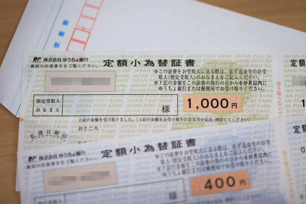 たとえば1,400円送りたい場合の手数料は、1,400円の小為替はありませんので、1,000円+400円の2枚となり、手数料が400円かかります。近年なかなか見ない送金コストですよね。