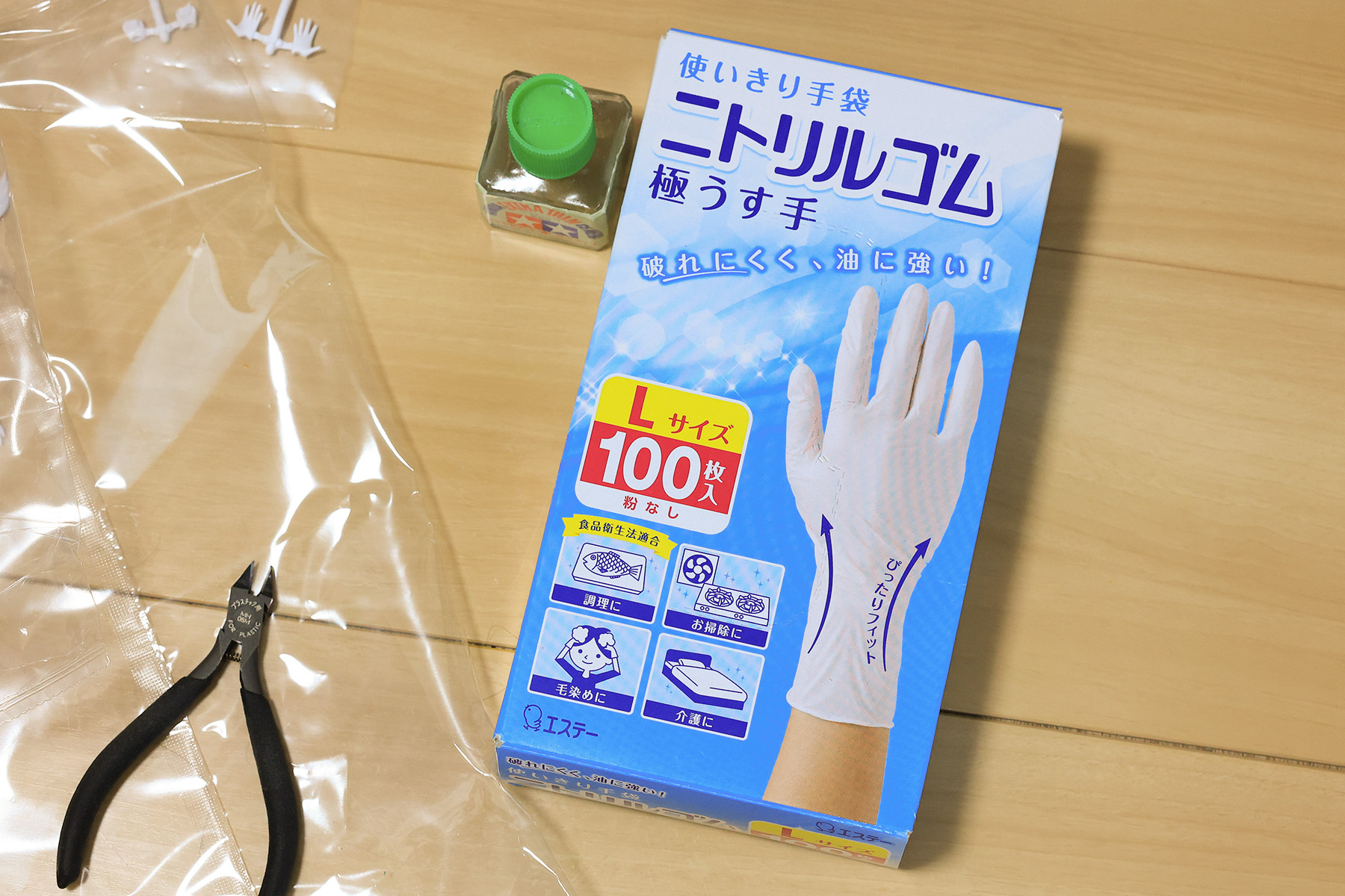 以前は10枚パックを使っていましたが、今度は100枚パックなので、まぁ数年は持つでしょう。ただ、手袋使うと指先の微妙な感覚が鈍くなるので、パーツを意図せず汚してしまうことが増える気がするんですよね。でも塗装作業が立て込むと有機溶剤や洗剤で手がガサガサになるのも気になって、手袋を常用することにしました。