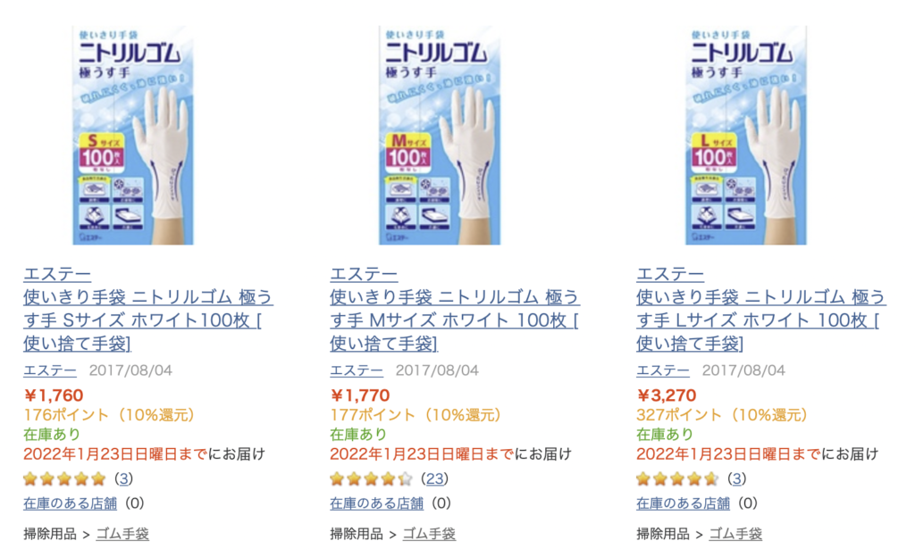 それよりなにより、トップバリューの手袋は手がアレルギー反応を起こしてしまって、手の甲が真っ赤に腫れ上がってしまいました。妻には「手袋の粉でそうなることがある」と言われましたが、一応トップバリューのもパウダーフリーなんですよね。