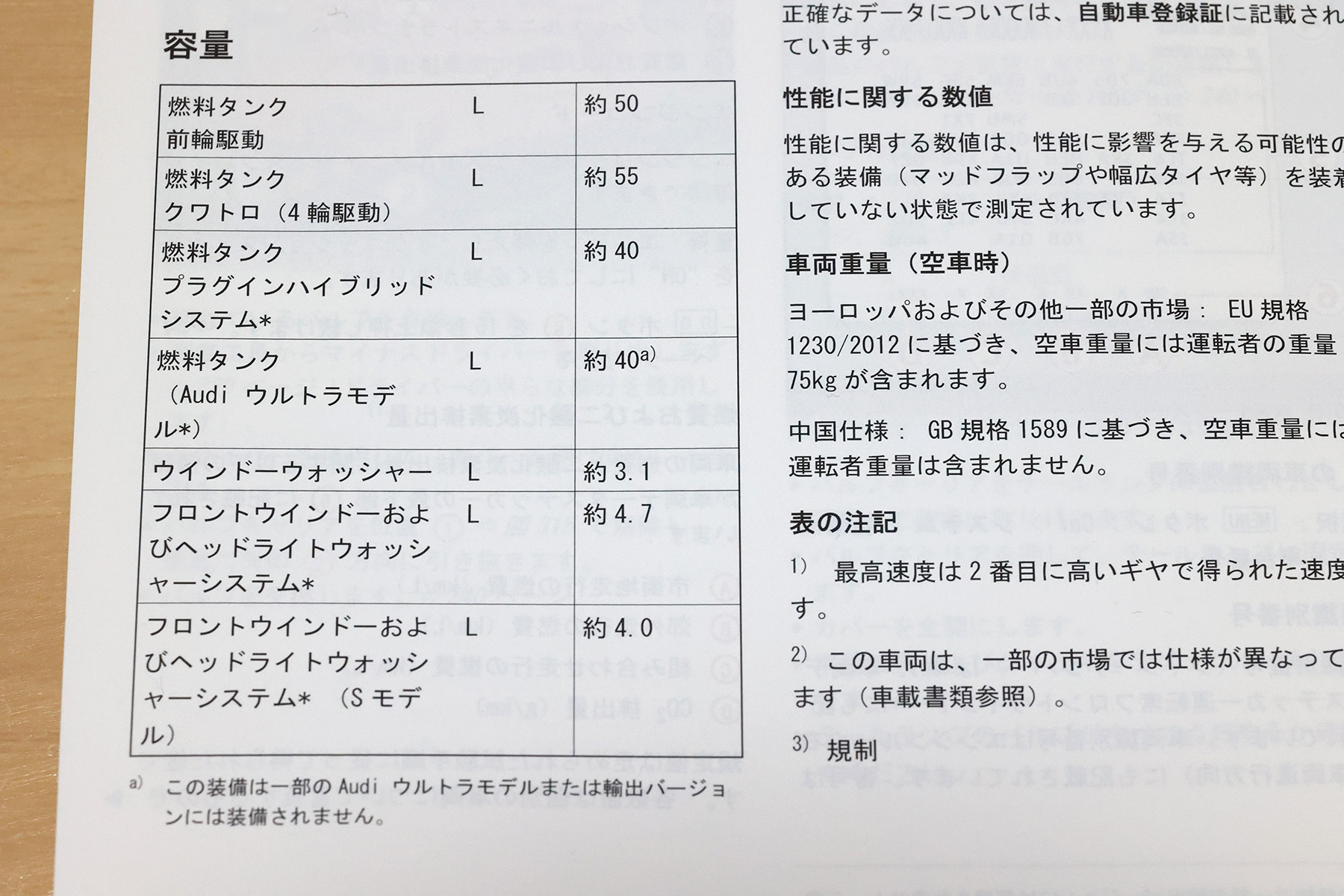 というのも、2Lのウオッシャー液を全量入れても、全然満タンになる気配がなかったんですね。一体ウオッシャー液のタンクは何リッターなんだろう…と説明書を見てみたら、ちゃんと書いてありました。