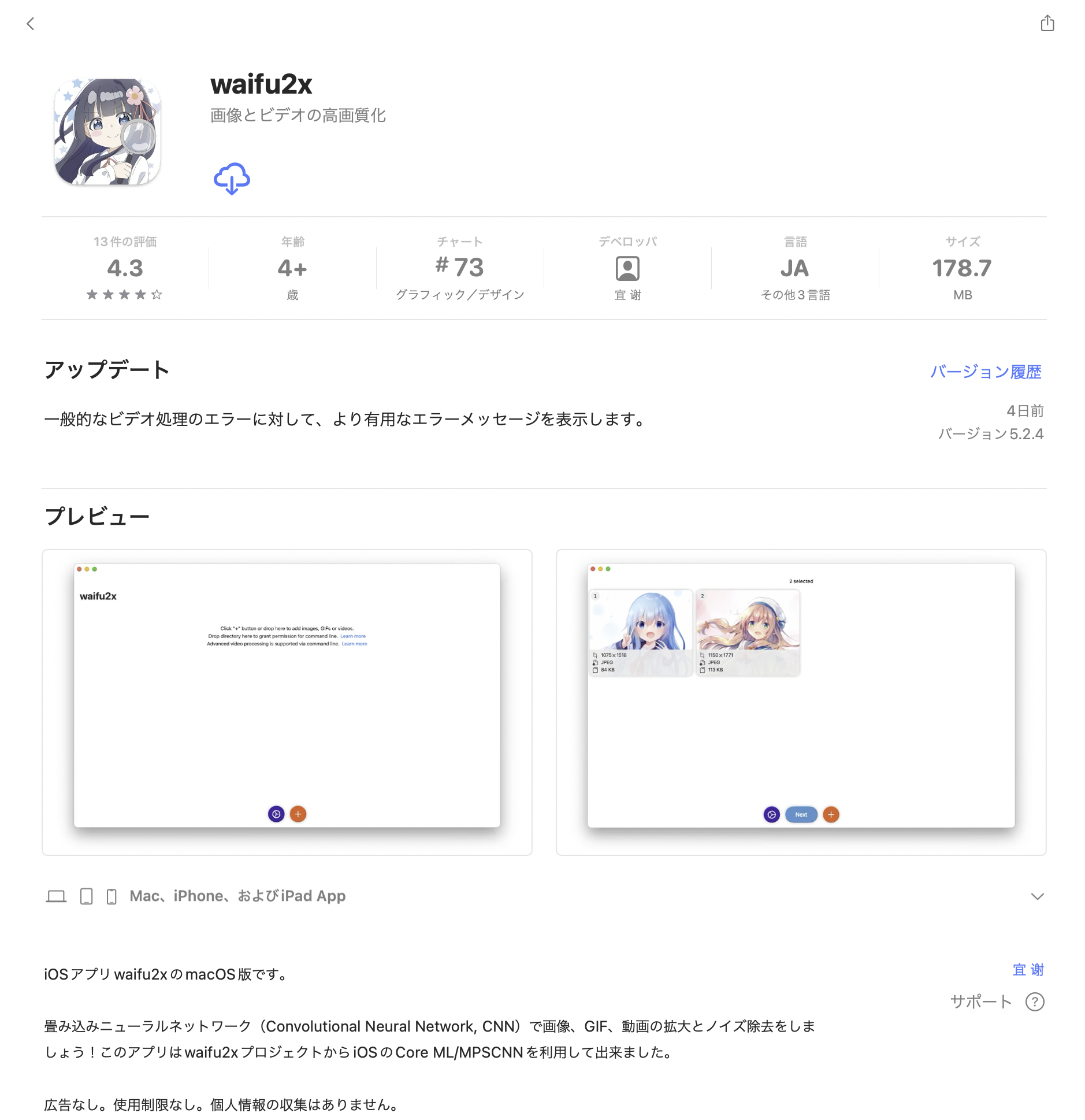 Mac版 waifu 2xこと、waifu magnifierがメジャーアップデートして、本当の waifu 2xになりました。