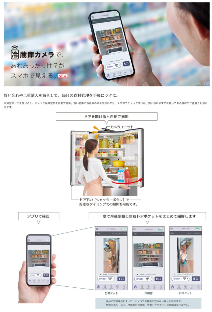 これがあればスーパーから在宅の家族に「にんじんあったっけ?」って聞く必要がなくなりますね。あ、野菜室は撮れないのか…。