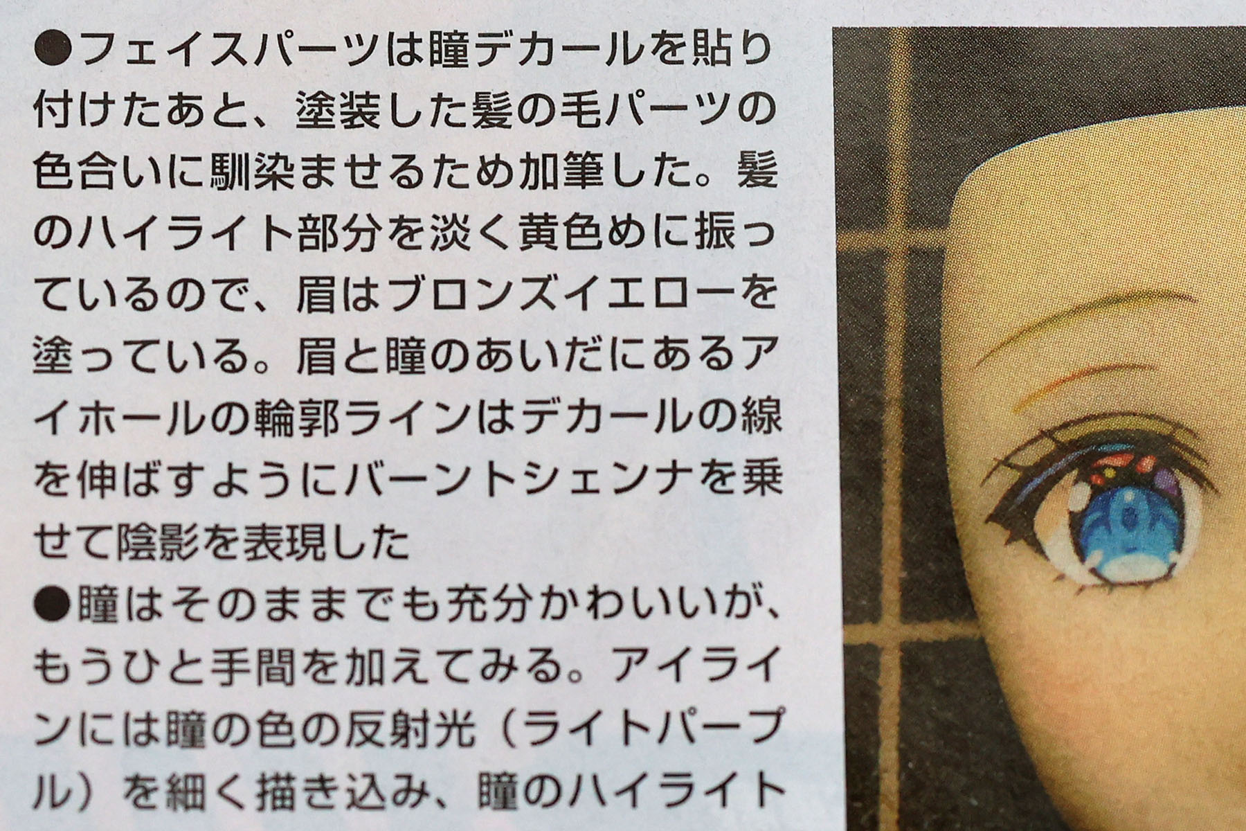描くの!?(;´Д`) まぁミンメイに比べたら倍のサイズあるし…ってのはありますが、デカールの上に筆を走らせる自信はないです。一発勝負じゃないですか。もう私の手の震えの限界を超えています。そもそも瞳デカールを貼ると言うことはコトブキヤ限定特典の「タンポ印刷なし顔パーツ」を使うってことですね? いやもう、ここは通常のパーツで我慢します(笑。手先の器用さの観点から無理です、もう。