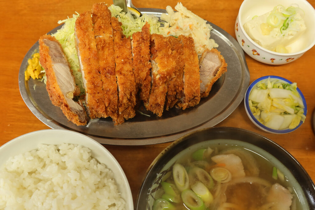 隣のテーブルには東京から来たという4人組の壮年男女。うち1人の女性が「玉子丼」を注文したところさほど量が殺人的ではなく、「思ったほど大きくなくて良かったね」とか話していたところに私が着席、メニューも見ずに「ジャンボとんかつ定食」とオーダーしたのでガン見されてしまいました。でも私の体格ならジャンボとんかつ定食でもおかしくないでしょう? ちょっと、ひそひそ声で「ジャンボ…」とか言うのやめて貰えますか。メニューも見ないでオーダーしたので常連かと思われたかも知れませんが、自分だって東京ではありませんが一応横浜から来てますから! 4回目ですけど。