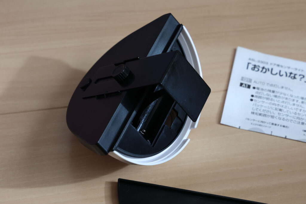 周囲の明るさが暗い状態で、人などが感知範囲に入るとLEDが点灯します。アルカリ単三電池3本で、14ヶ月動作するそうです。そんなに頻繁に点灯させなければ2年は持つのではないでしょうか。LEDと、半導体の低電力化で実現できた製品ですね。ありがたいことです。