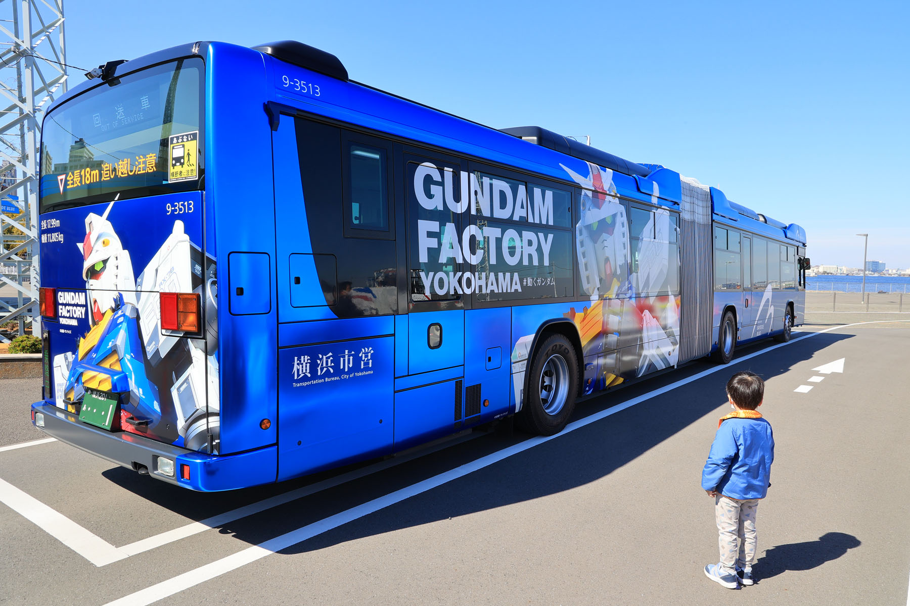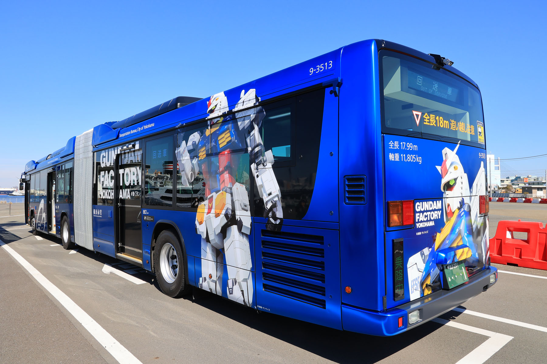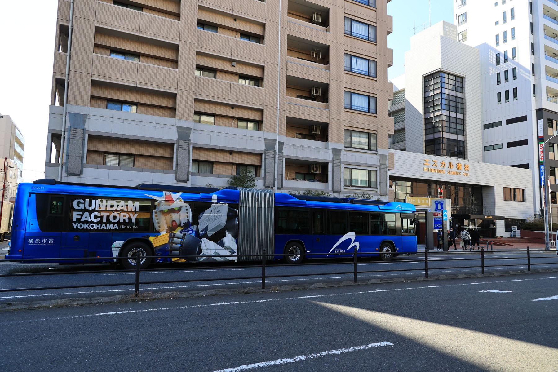 ガンダムファクトリー横浜と横浜駅を結ぶ連節バス「ベイサイドブルー」のガンダムラッピングバージョンが2/23より運行されているというので撮ってきました。