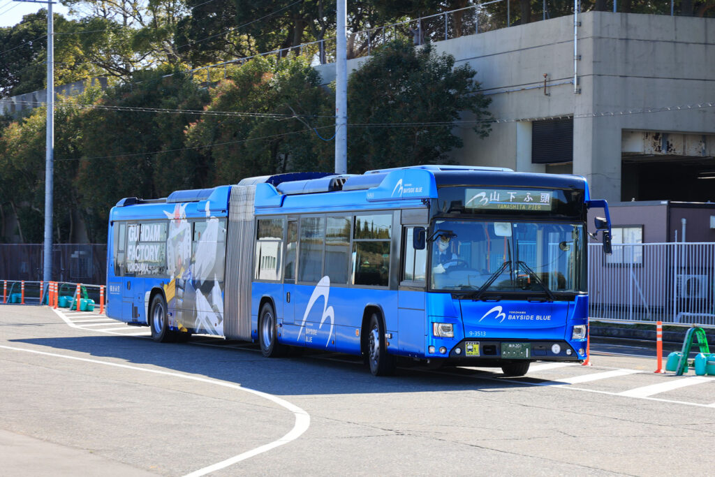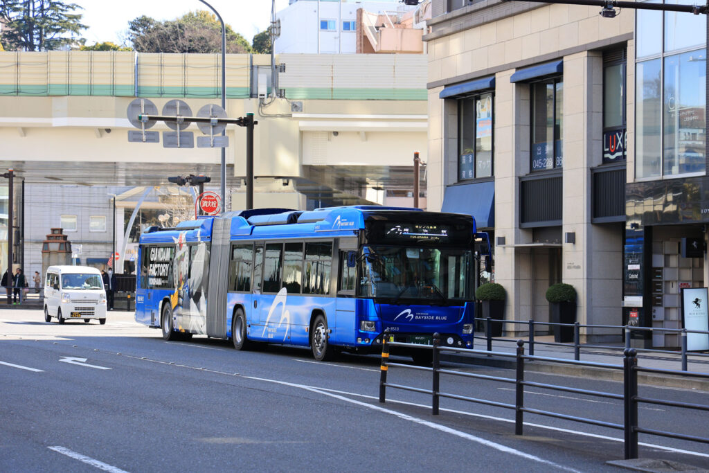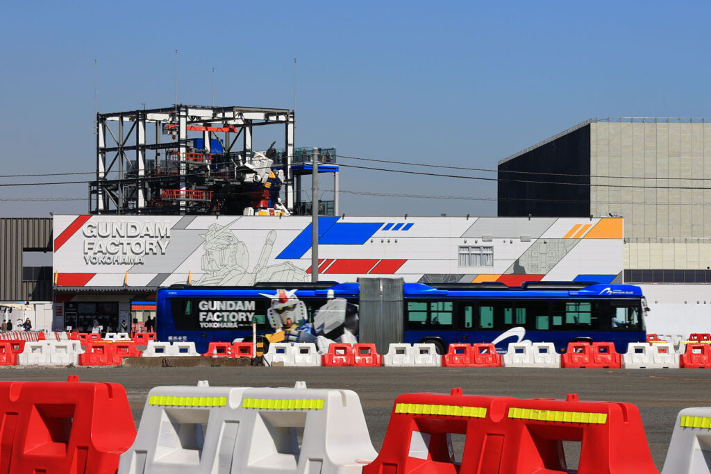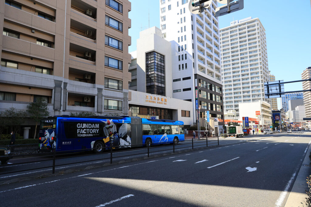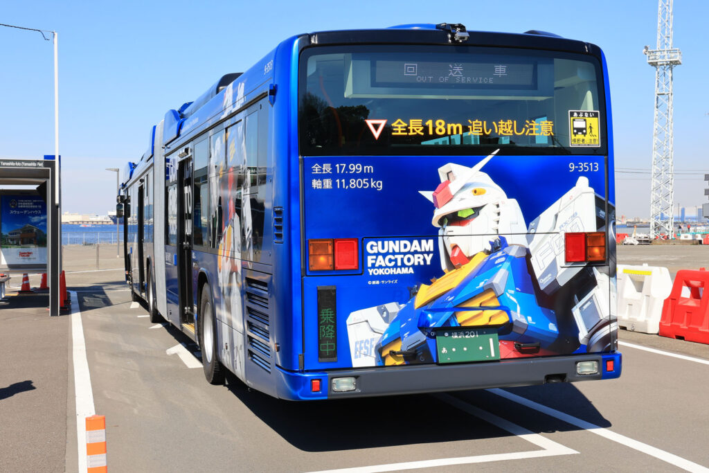 ガンダムファクトリー横浜と横浜駅を結ぶ連節バス「ベイサイドブルー」のガンダムラッピングバージョンが2/23より運行されているというので撮ってきました。
