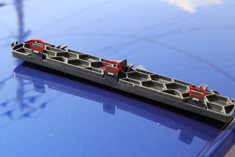 そして今年もエアコンフィルター装着部のフタを外すのに一苦労。全く成長しません。ポイントは爪の先端だけを押し下げること。そうすれば簡単に外れます。この爪の部分と車体側の爪を受ける部分が一体化していて両方いっぺんに押し下げようとしてしまいがちなので外れないのです。先端だけを押し下げましょう。VW GOLF、Audi TTなども同じ部品です。