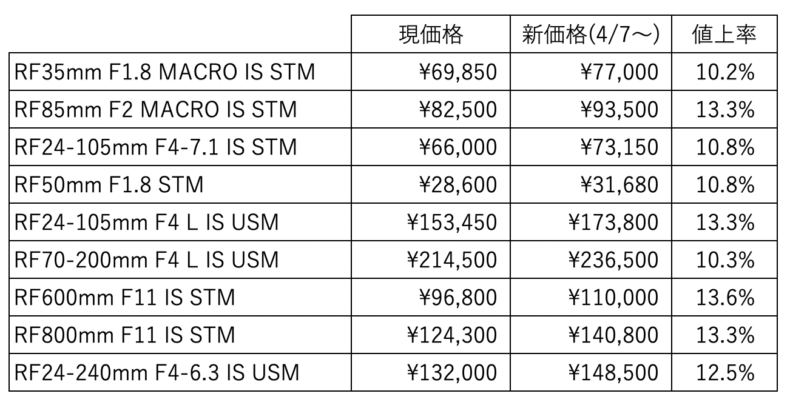 キヤノンがRFレンズの価格改定をするようです。全て値上げ方向で、キヤノンオンラインショップでの値上がり率は、10〜14%程度。リンク先PDFでは現価格との比較がなかったので、20万円以下くらいのモデルを抽出して比較してみました。いずれも税込価格、値上げ実施は4/7です。