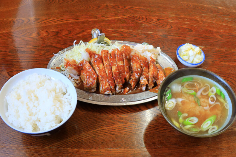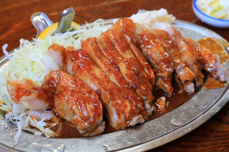 最後は看板メニュー「焼肉定食」で締めようかと思いましたが、今まで食べたことのなかった「特製焼肉定食」に。おそらくジャンボとんかつ定食の肉を、焼肉定食のタレで焼いたものと思われます。ご覧の通り、焼肉と言うよりはトンテキです。