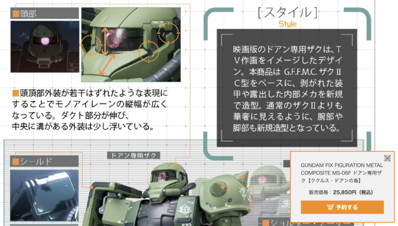 下の画像は「GUNDAM FIX FIGURATION METAL COMPOSITE」という、まぁDX超合金クラスの高価なザクの模型ですが、設定はよく考えたものです。