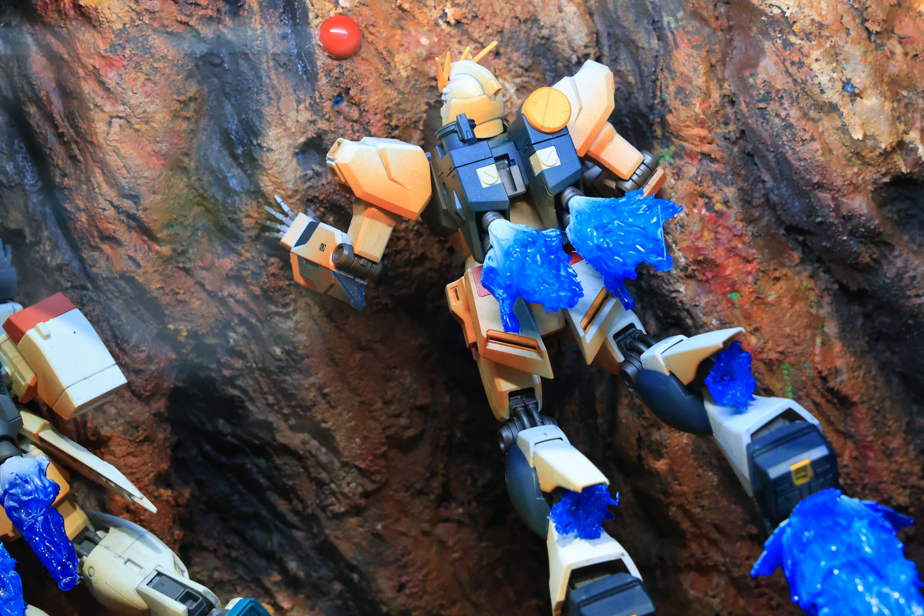 展示してあった「たかが石ころ1つ、ガンダムで押し出してやる!」ジオラマ。オレンジ色の照り返しは照明ではなく塗装というのが秀逸。こんな塗り方があるのか…。