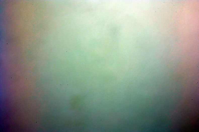 これがキヤノンSCK-E1で掃除したあとの画面。ホコリが見えやすいように画像処理しています。周辺に細かいゴミのほか、中央付近上下にシミ状の汚れも見えます。SCK-E1で却って汚してしまったかも知れません。