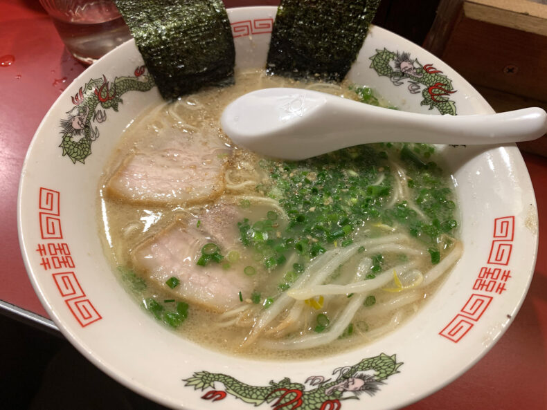 劇中ではゴローちゃんは「替え玉」に「おでん」まで注文していましたし、私の左に座っていた人もおでんを注文していましたが(負けた)、私はもう結構お腹いっぱいだったのでラーメンだけを注文。博多ならではの細麺と、やさしめの味の豚骨スープ。そして何よりチャーシューがいい味! 割と満腹なはずなのにするすると胃に入ります。