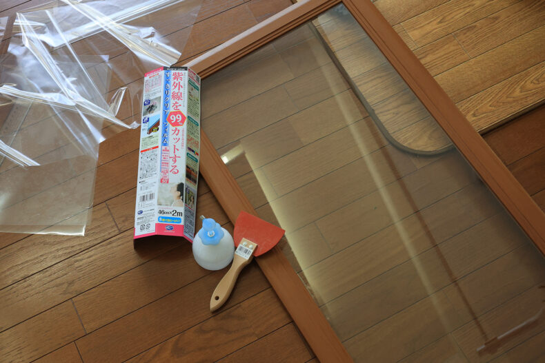 日焼けしたVF-25対策として、飾り棚(リフォーム前は食器棚)にUVカットフィルムを貼りました。紫外線を99%カットする…というと何やら特殊素材のようですが、たぶん普通の樹脂です。樹脂は紫外線をカットしますので。