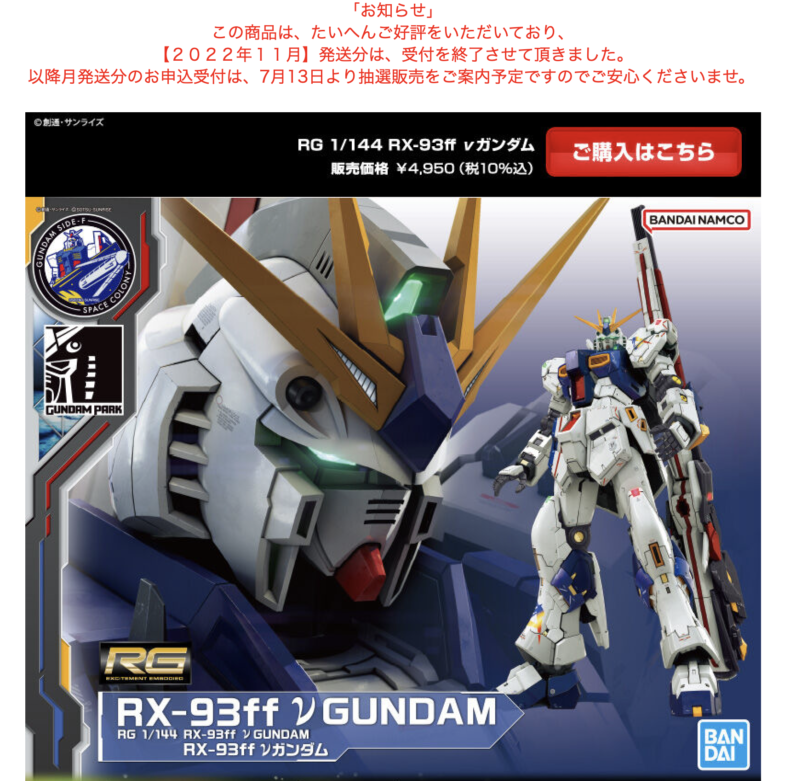 RX-93ff 福岡νガンダムのRGモデルについて、抽選販売を実施するそうです。前回6月の一般販売では2分で瞬殺だったので、仕事中でネットに貼り付けない方でも平等にチャンスがあるので良いのではないでしょうか。これは現地販売と違って欲しい人のチャンスを奪うことになるので、転売erには遠慮して欲しいですね。もっとも遠慮してくれと言って話が通じる人たちとも思えませんが。