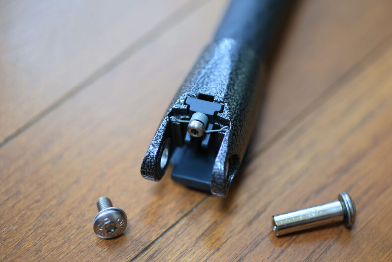 元あったのと同じようにレバー、バネ、ネジの3点を新品に交換するだけです。ただ、バネが少し寸法が合わないようで、交換前のようにレバーを引ききった状態でロックがかかりません。バネを少し曲げて交換前と同じ動作になるようにして完成。これを2本やります。(2本ともバネの寸法が大きかった…この辺がMADE IN ITARYの雑なところか…)