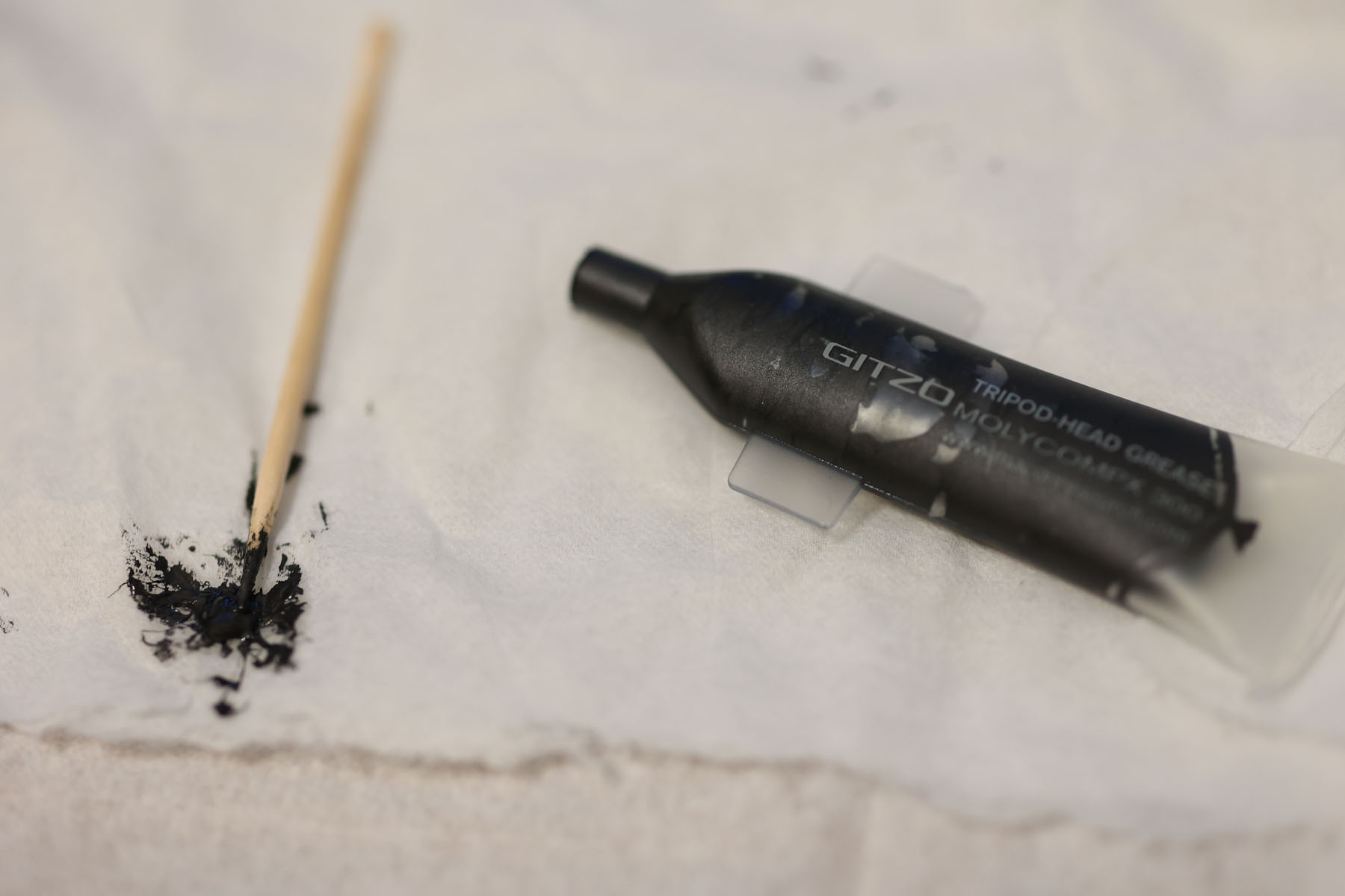 折角バラしたのでグリスアップしてあった箇所にグリスを補充します。グリスはGT1542には付属していなかったのですが、その前に買ったGT2531に付属していたもの。結果、3本脚中の修理した2本だけ動きがスムースになったので(;´Д`)もう1本の脚も外してグリスアップ。なおこのグリスはちゃんとキャップが閉まりますし、2本1,300円ほどでカメラ店で買えます。