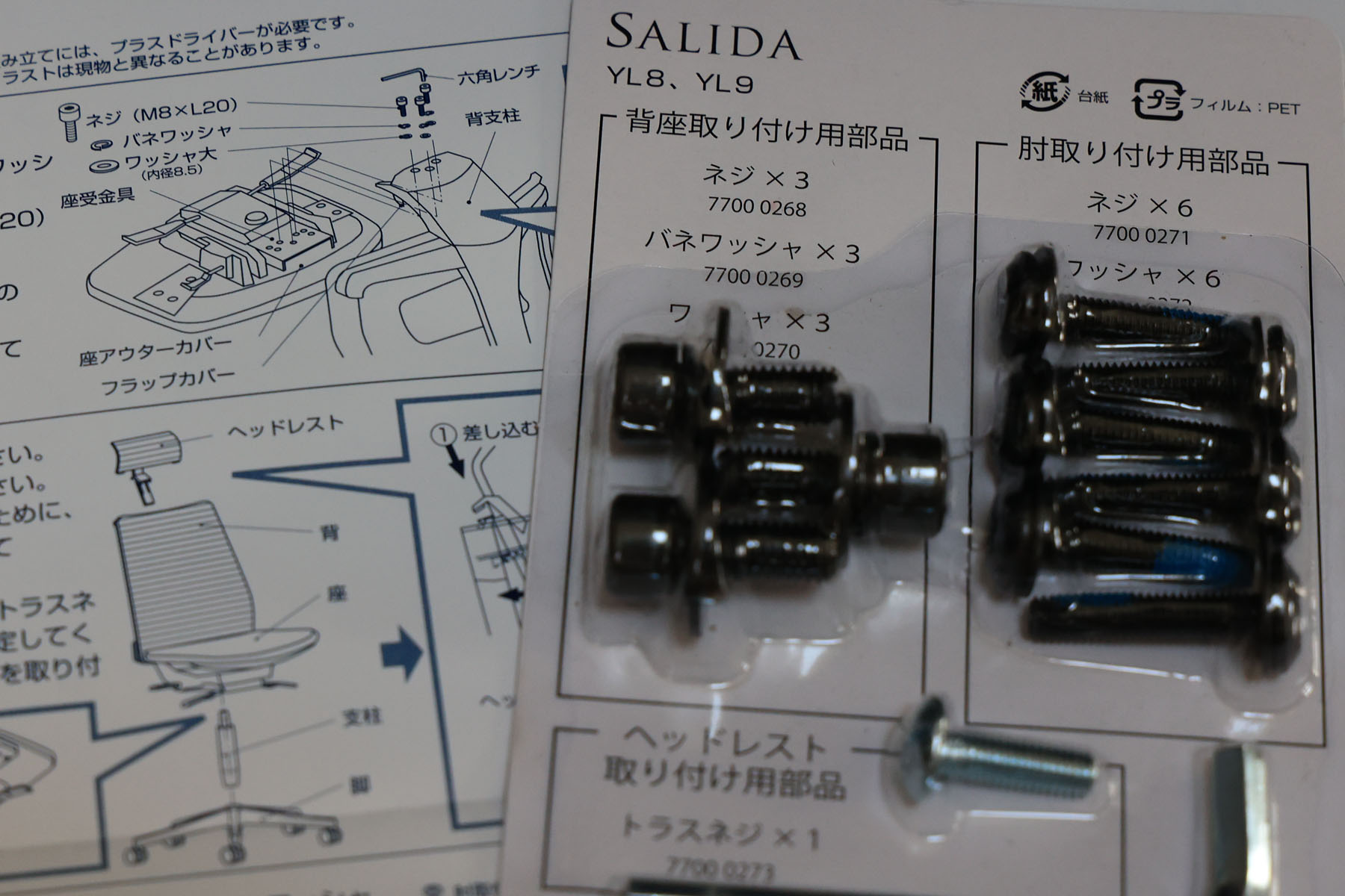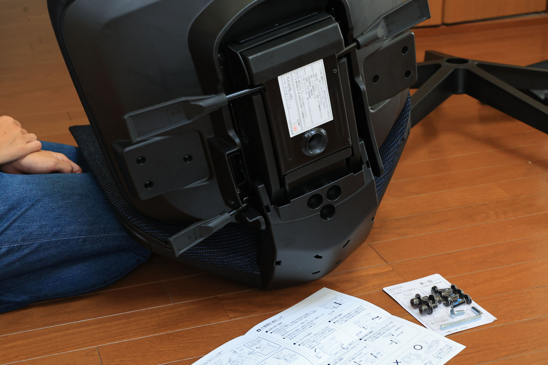 各所のユーザーレビューを見ると最初の組み立て工程である背もたれをネジ止めするのが最大の難関のようなのですが、そうか?と思いながらやってみたら、確かに難関でした。スポッとはめてからネジ止めすればよいのではないかと思いましたが、スポッとはめた位置から少し戻さないとネジ穴位置が合わないのです。これは1人では難しい。