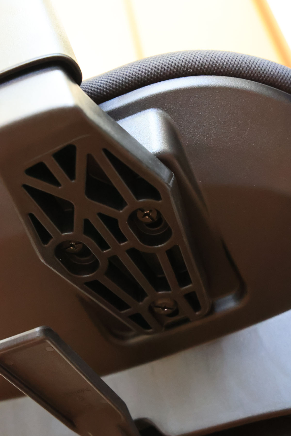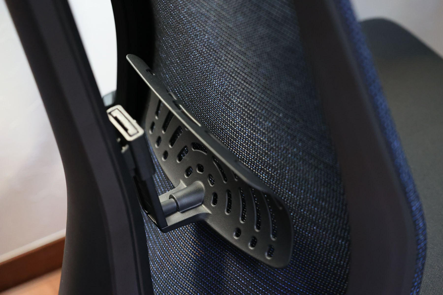 ランバーサポート。高さ調節可能ですが、新品時はファブリックの張りが強くて腰がランバーサポートに接触しません(リクライニングしても)。ファブリックがへたってきてから有用になるのでしょうか。