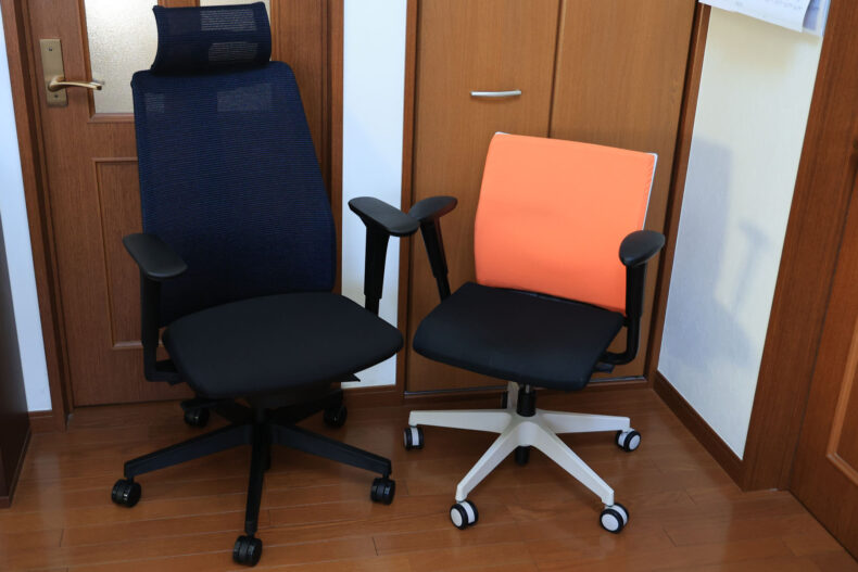 以前購入した「コペルチェア」(右)と並べてサイズ比較。コペルチェアは仕事用ではない家族共用iMac用の椅子ですが、これでも充分な大きさはあったのですが、購入したサリダチェアはさらに座面が大きくてゆったりしています。ちなみにコペルチェアの方は車輪がウレタン(フローリング向き)ですが、サリダチェアの方は車輪がナイロン(カーペット向き)です。いずれにしても傷つき防止のチェアマットは使うので、車輪の種別はあまり拘りません。なおサリダチェアも4,000円で別売のウレタン車輪が購入できます。