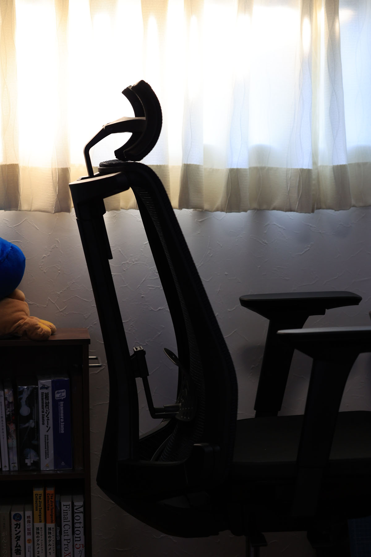 在宅勤務スペースにて。こうやって見ると背当ては薄いようで、物理的なスペースは結構必要とします。