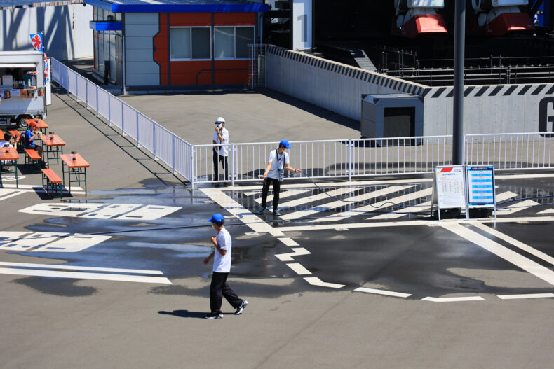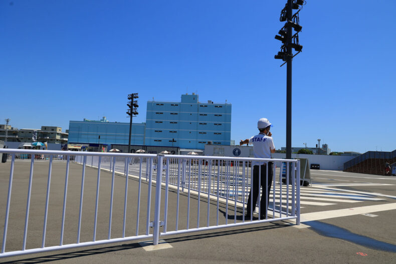 とても暑い日だったので、水が蒔かれていました。給水装置ってどこにあったっけ?と思ったら、ドックタワー裏、または、会場出口付近から延々とホースを引っ張ってきていました。
