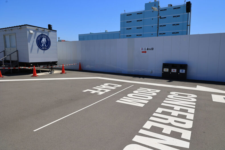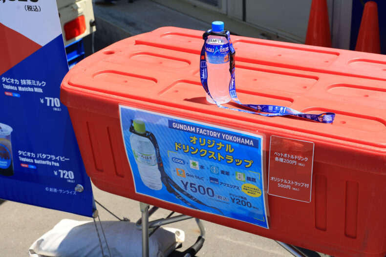 このガンダムの右前にいる係の方が三脚に関するレギュレーションをアナウンスするのですが、この日は2名交代制で、1人は「三脚は広げないようお願いします」、もう1人は「三脚一脚は使用できません」と、アナウンスが統一されていませんでした。もっともこの日はガンダム向かって左側にもキッチンカーとテーブルが出ていたので、三脚を使う場所はなかったです。