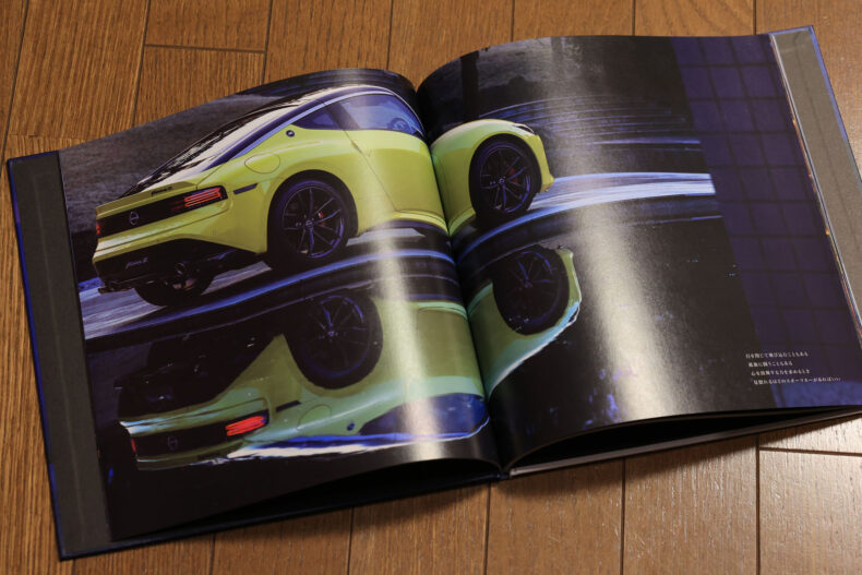 フェアレディZ。フルモデルチェンジにように見えますが、シャシーをキャリーオーバーしたビッグマイナーチェンジで、型式はいわゆる「Z34 (RZ34)」のままです。そのカタログの作りは写真が中心で、言葉は少なくエモーショナルに訴えかけてきます。