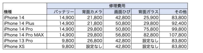 まずこれがApple Care+に入っていない場合の現在の修理料金。iPhone 13とXSは比較参考用です。