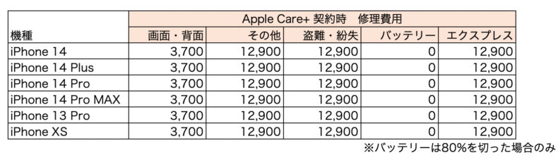 これらの修理料金がApple Care+に入っているとどうなるか: