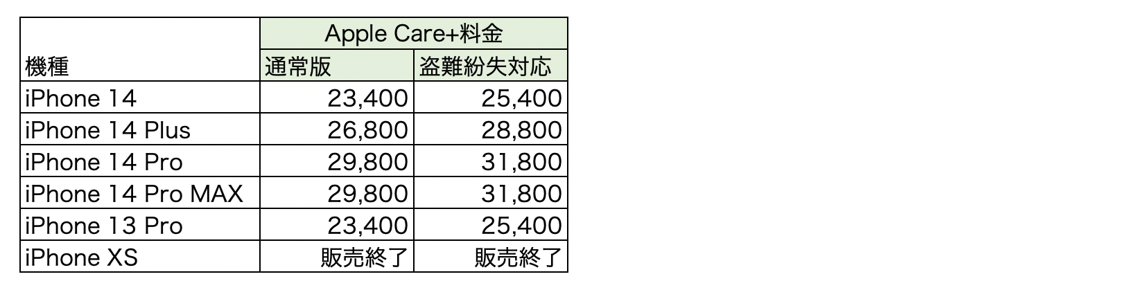 そしてこれがApple Care+自体の料金。これを見ると背面カメラ故障くらいだったらApple Care+に入らない方がお得な気がしますが、これは保険。購入するのは「安心」だと思えば、安いもの…とまでは言いませんが、まぁ契約してもいいかなぁという気もします。私はXS購入時にも入りましたが、今回も14 ProでApple Care+に入りました。