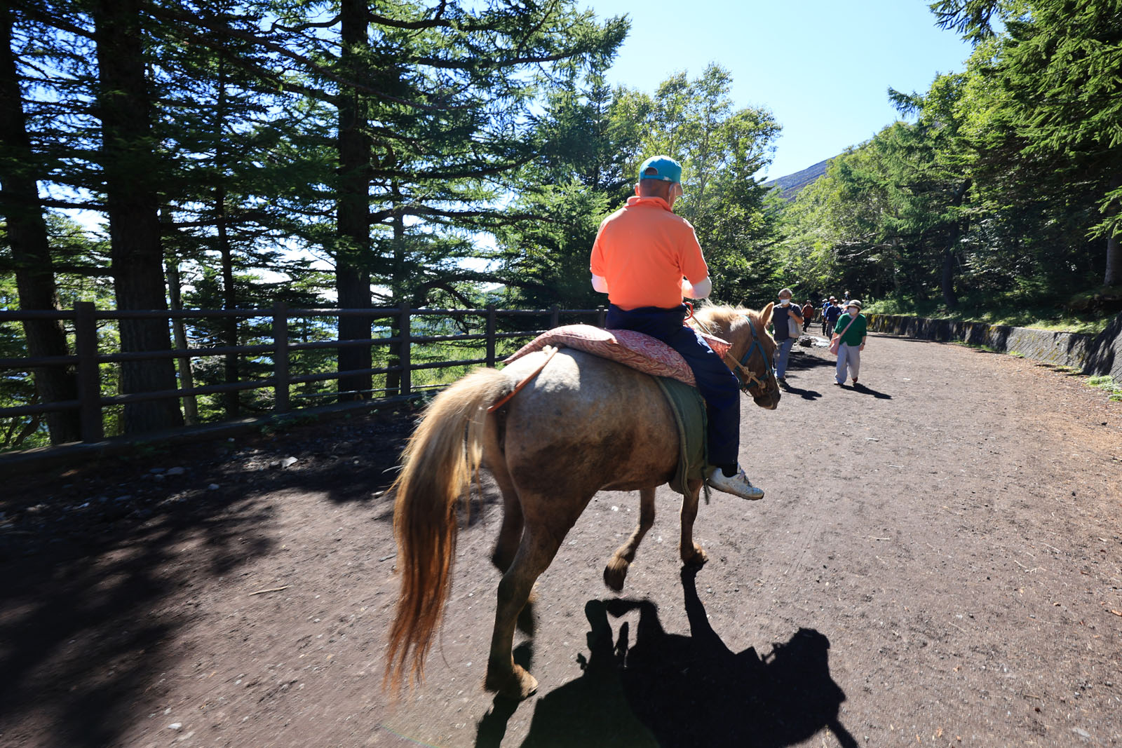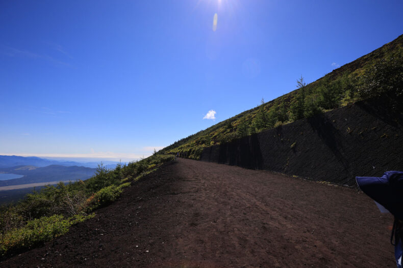 戻ります。右奥の森の中にある小さな白いのが吉田口五合目の施設。あそこまで戻ります。まぁちょっとだけ富士山の雰囲気を感じたかったのでこれで充分です。もうちょっと静かな雰囲気を想像していたのですが結構登山客が多かったので賑やかでした。