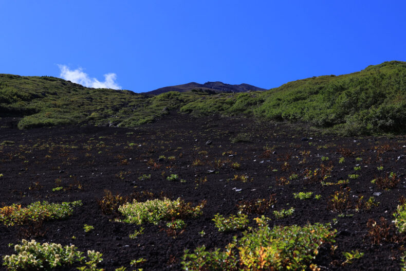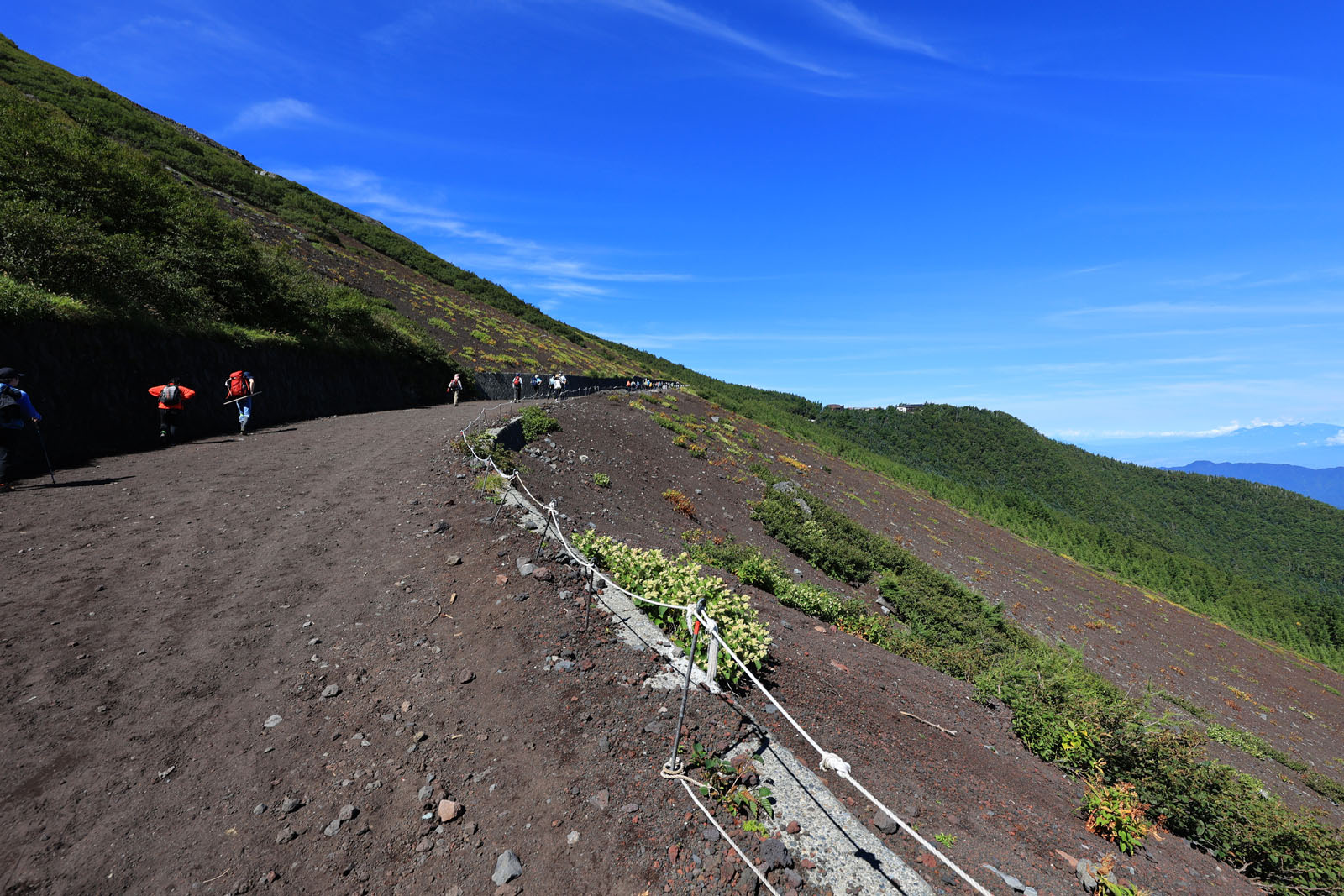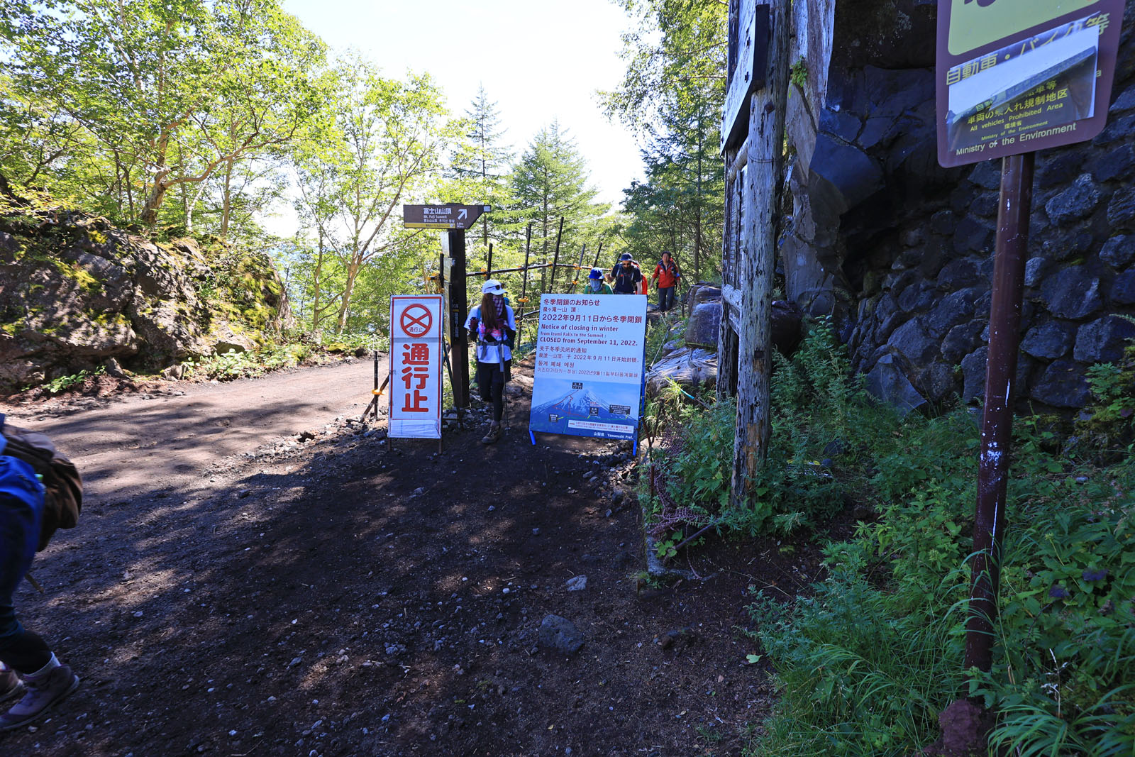 もうちょっと行ったところで通行止め。6合目までは行けず、だいぶ手前のところでSTOPです。5.5合目くらい? もっとも、今日は最初からこのへんまでしか来るつもりはありませんでした。靴も普通のスニーカーですし。この看板から先がグッと斜面がハードになります。