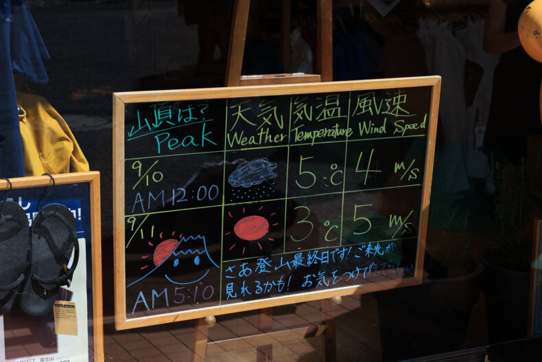 ここで、「通行止め」看板の向こうから下山者がぞろぞろ降りてくるのが今日ならではの景色。このとき時刻は9:30くらいでしたが、降りて来た方に「今朝ご来光見てから降りてこられたんですか?」と聞いてみたところ、「そうです。今朝5時にご来光を見てから降りてきました。しんどかったー」とのこと。下山時間4時間ちょっとですかね。