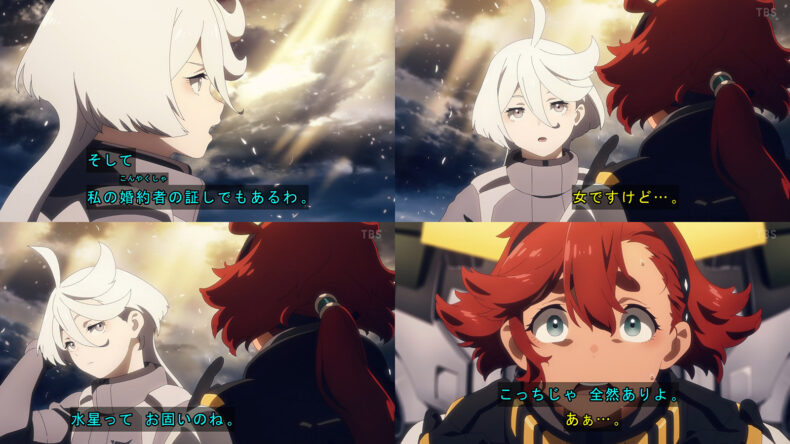 主役のスレッタちゃん、設定画では「たぬき」とか言われていましたが、動くとむちゃくちゃ表情豊かでいいですねぇ。白い学校の制服は、初代ガンダム世界で言うところの士官服か、あるいはリコリスで言うところのファースト(優秀なリコリス)の制服かと思っていましたが、まさか花婿の衣装だったとは…。
