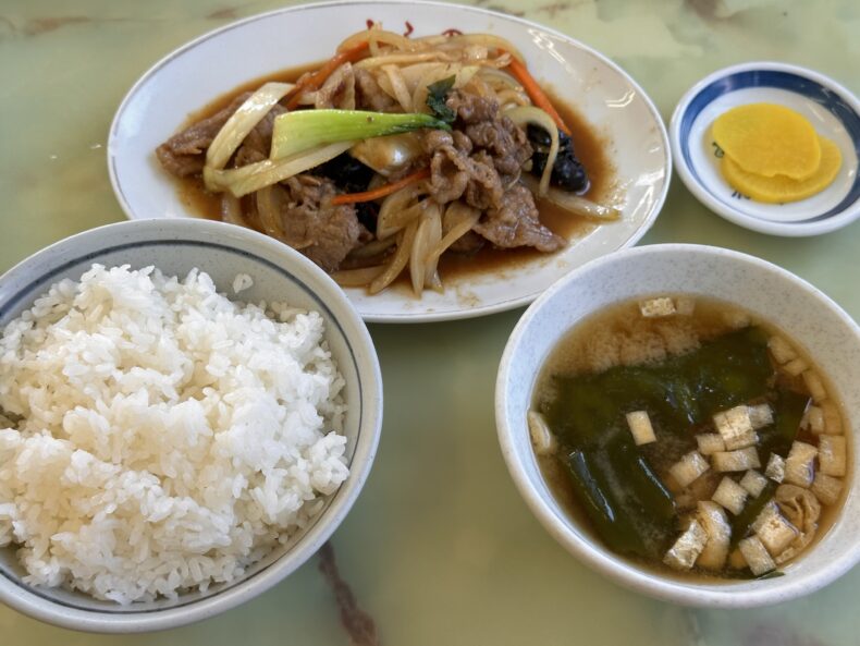 牛肉のスタミナ定食、濃いめの甘辛い味付けでご飯が進みます。めっちゃ好み。ちょっと私のお皿は肉少なめで玉ねぎ多めに感じられましたが、まぁ良し。味噌汁は一般的な汁椀ではなく瀬戸物の茶碗で、これがまた舞木ドライブイン感があります。但し容量は舞木ドライブインの半分程度、具もシンプルですし常識的な範囲内です。
