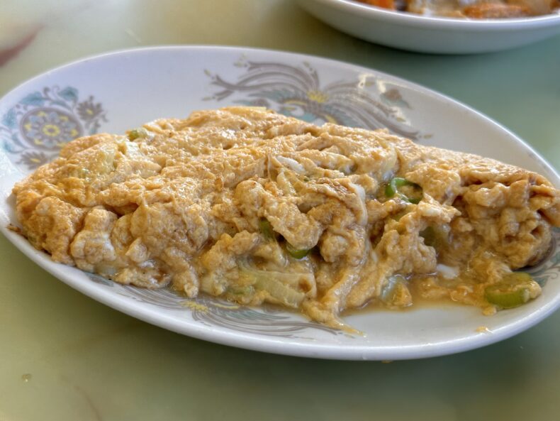「ねぎ玉」(385円)。長ねぎをとじた卵焼き。これは自宅でも容易に再現可能で実際私も弁当に入れたり朝食に作ったりしていますが、こういうのが街の食堂で食べられるとホッとしますね。ゴローちゃんは醤油をかけていましたが、味は付いています。自分で作るときはネギを先に炒めて少し水分を飛ばしていますが、ここは放映を見る限りネギより先に卵を入れるようで、しっとり目の仕上がりです。