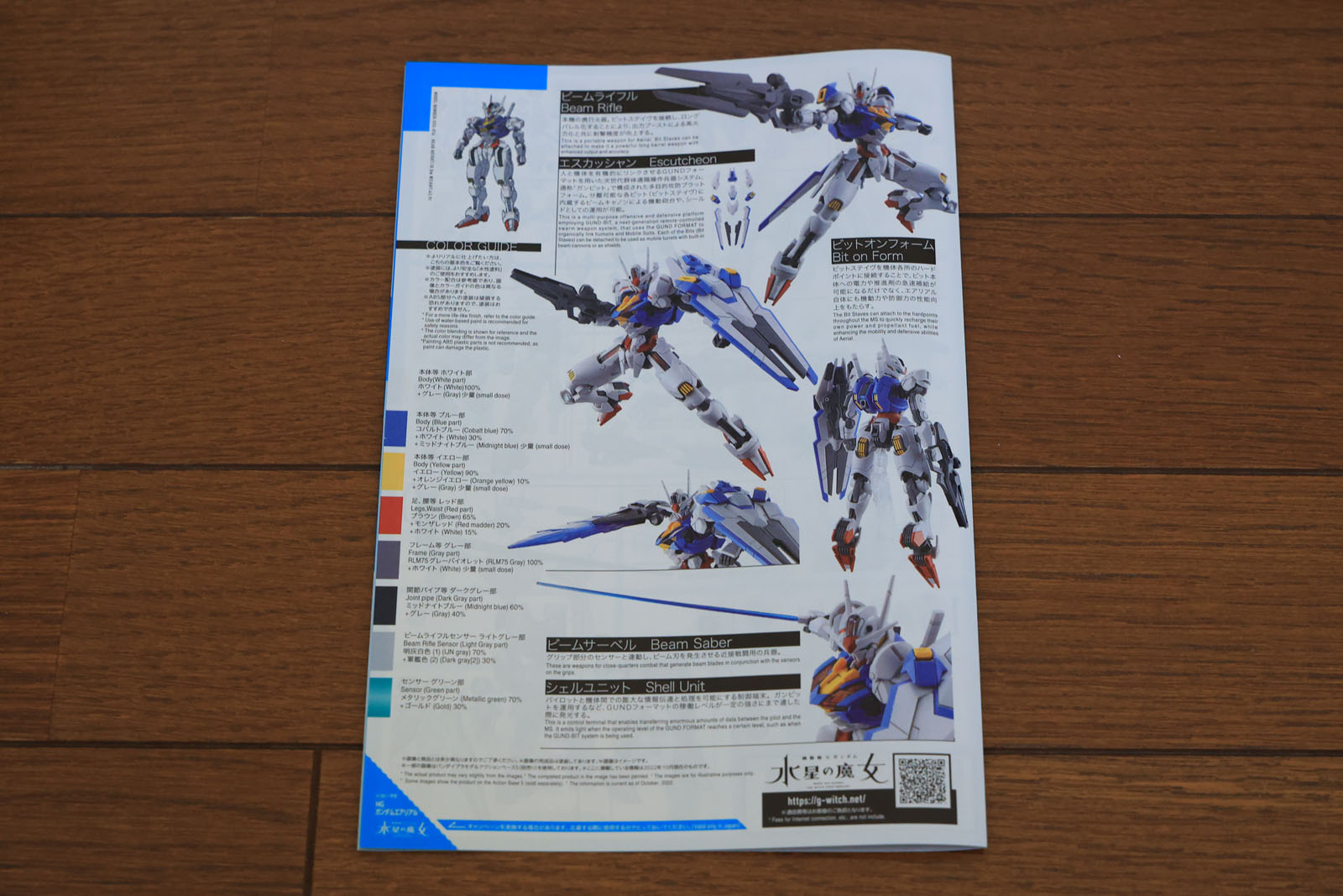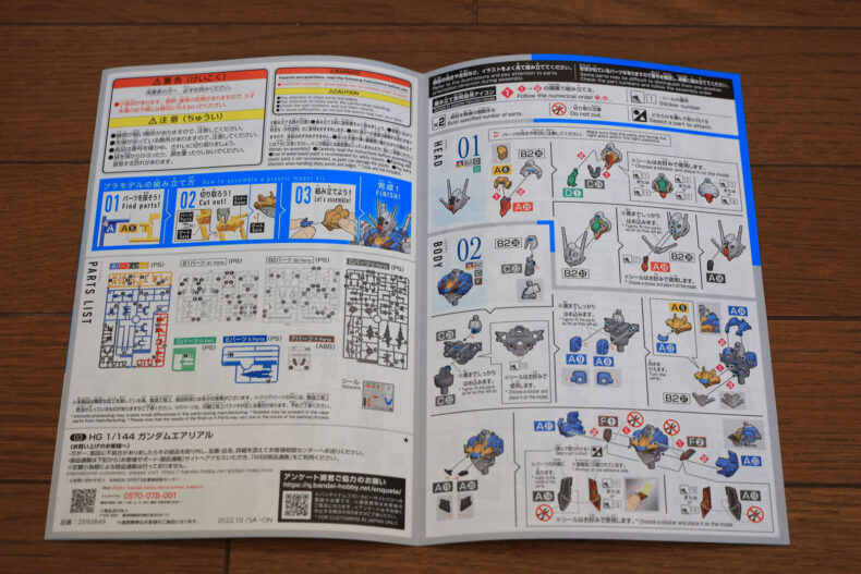 色プラパーツの組立部分はカラー印刷です。なお、部品請求カードはついに完全Web申し込み化され、省略されています。過去のガンプラに付属している部品請求カードもすべて無効になるようです。
