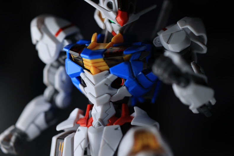 さて完成したエアリアル。スミ入れはタミヤスミ入れ塗料の「ブラック」「ブラウン」「グレー」です。黄色パーツに対してはブラウン、白パーツに対してはグレー、水色パーツに対してはブラックとセオリー通りです。トップコートはビームライフル以外は「光沢」にしてみました。