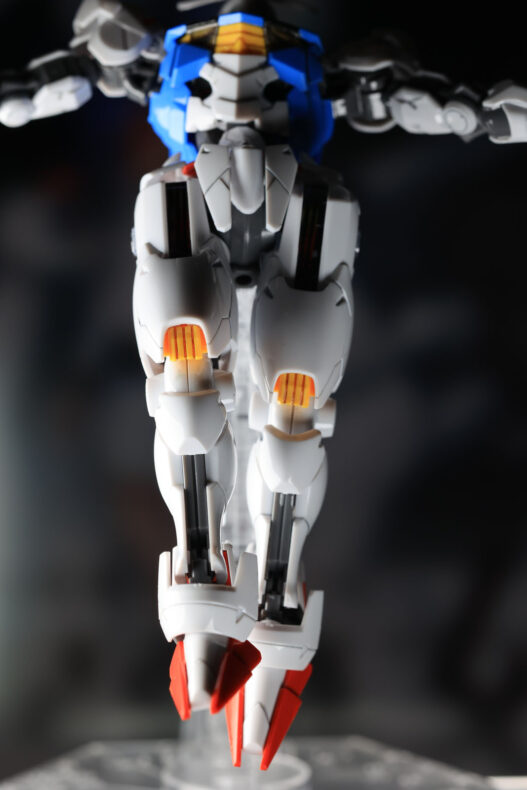 ちょっと女性的なデザインにも見えますね。Bさんも書いていましたが、過去のいろんなガンダムのデザインモチーフを寄せ集めたようにも見えます。特に背面フィンが多いところはターンエー、ほかガンダムエクシア(ガンダム00)、ガンダムバルバトス(鉄血のオルフェンズ)あたりにルーツを感じます。