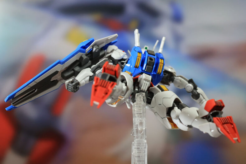 可動範囲の大きいガンプラにすることを前提にデザインされているので、わずか1,200円(実売)のキットながらとても広範囲に可動します。腕の横にはシールドを装着するための大きな穴が開いているのですが、これすら正規のデザインにされています。