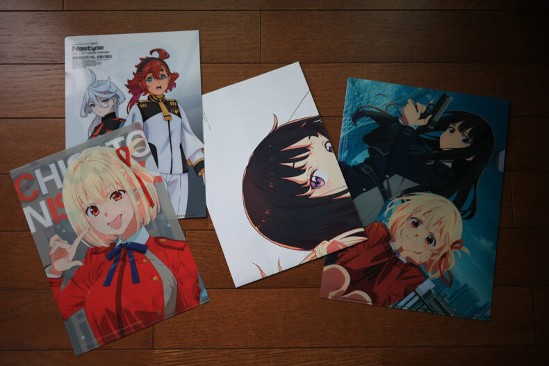 どちらも付録が付いていました。左2つが11月号の付録のクリアファイル、右2つが10月号付録のポスターとクリアファイルです。ちさと/ちさと/たきな/たきな/夫婦 ですね。リコリコ特集の10月号は気がついたらネットも店頭もぜんぜんなくて、HGエアリアルと一緒に川崎で買いました。