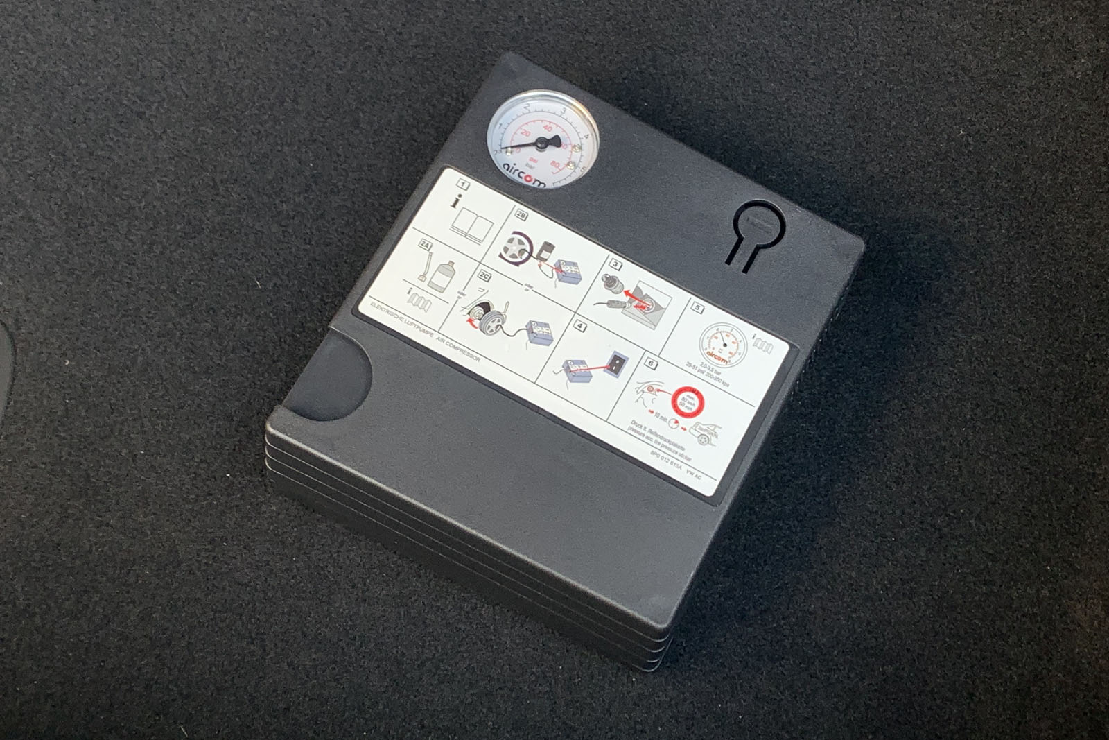 車載工具のパンク修理キットの電動ポンプを使用し、パンク修理剤を使わずに空気を入れてみたところ、一応車高は復活。空気はすぐに抜けそうもなかったので、そのまま最寄りのタイヤ店へゆっくり自走。