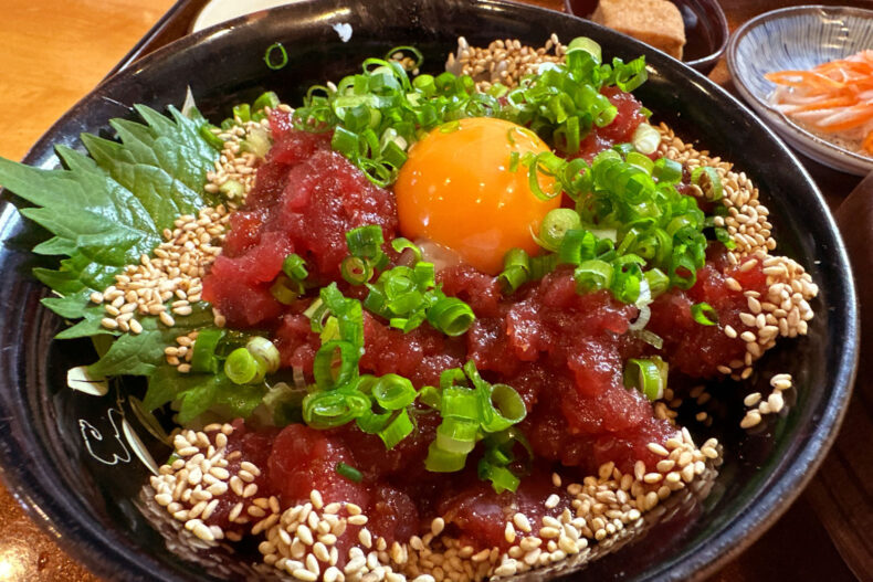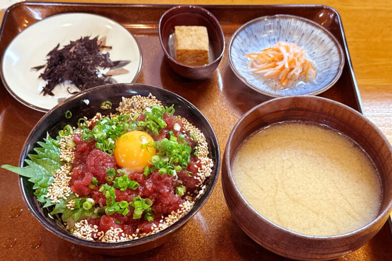 そしてメインディッシュ。マグロのユッケ丼(マグロのユッケどんぶり)。味噌汁はシジミではなくあら汁でした。