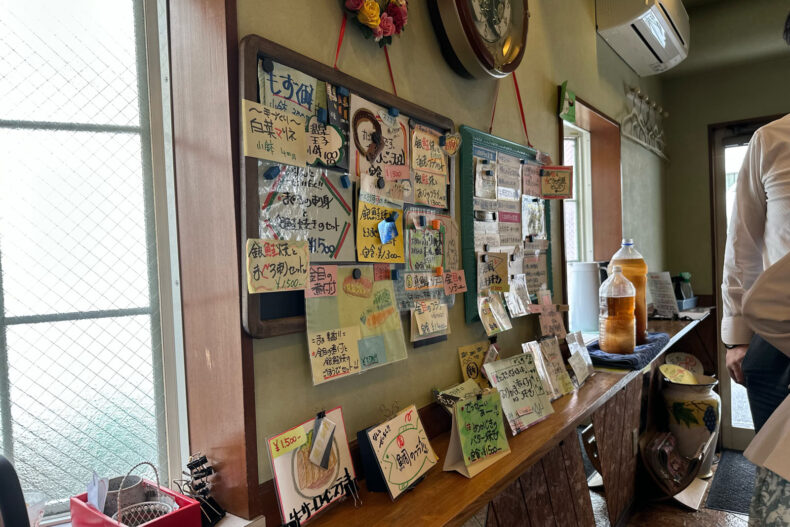 早速入店。昼時だったので少し待たされましたが、ほどなく着席。ゴロー席の右隣でした。壁に貼られたメニュー…さて、どっから見たらいいんだ。迷いだしたら底なし沼だ。