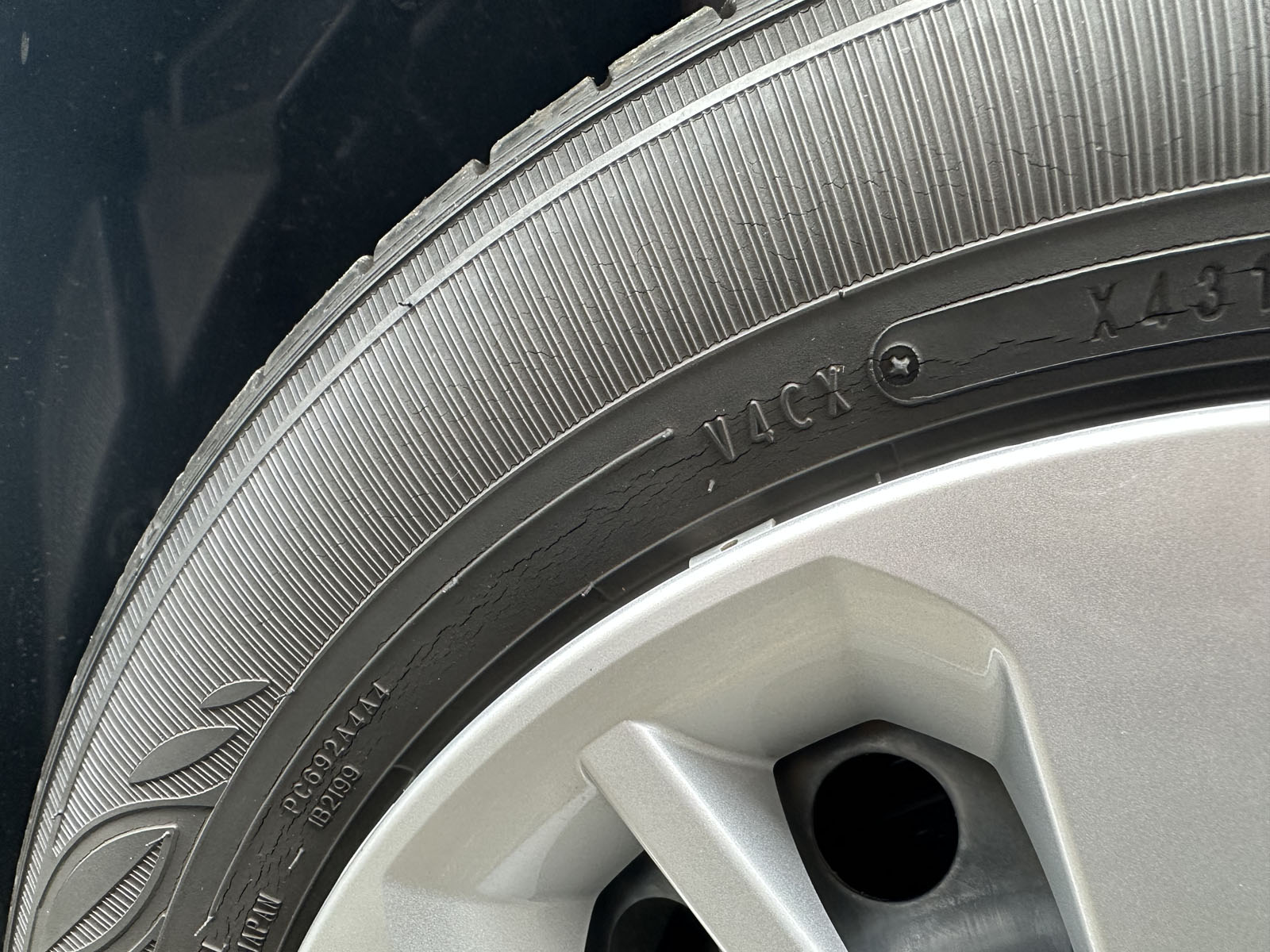 走行距離が4年で9,000kmくらいなので、タイヤもあまりたわむことがなく、劣化が加速してしまうようです。タイヤは動かさないでおくと劣化が加速しますからね…。それでも我が家の駐車場におけるタイヤの位置は年間を通じてほぼ日陰なので、条件はまだいい方だとは思いますが。